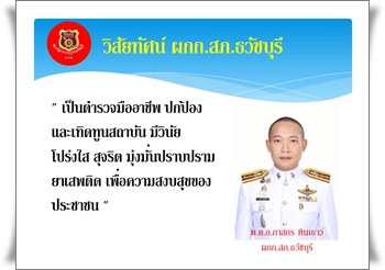 สภ.ธวัชบุรี 27 ม.2 ต.นิเวศน์ อ.ธวัชบุรี จ.ร้อยเอ็ด 45170เหตุด่วนเหตุร้ายแจ้ง 191043-569071 : 043-030214Police i lert u ติดต่อสอบถามหรือแจ้งเบาะแสระบบบริการอิเล็กทรอนิกส์ (E-service)